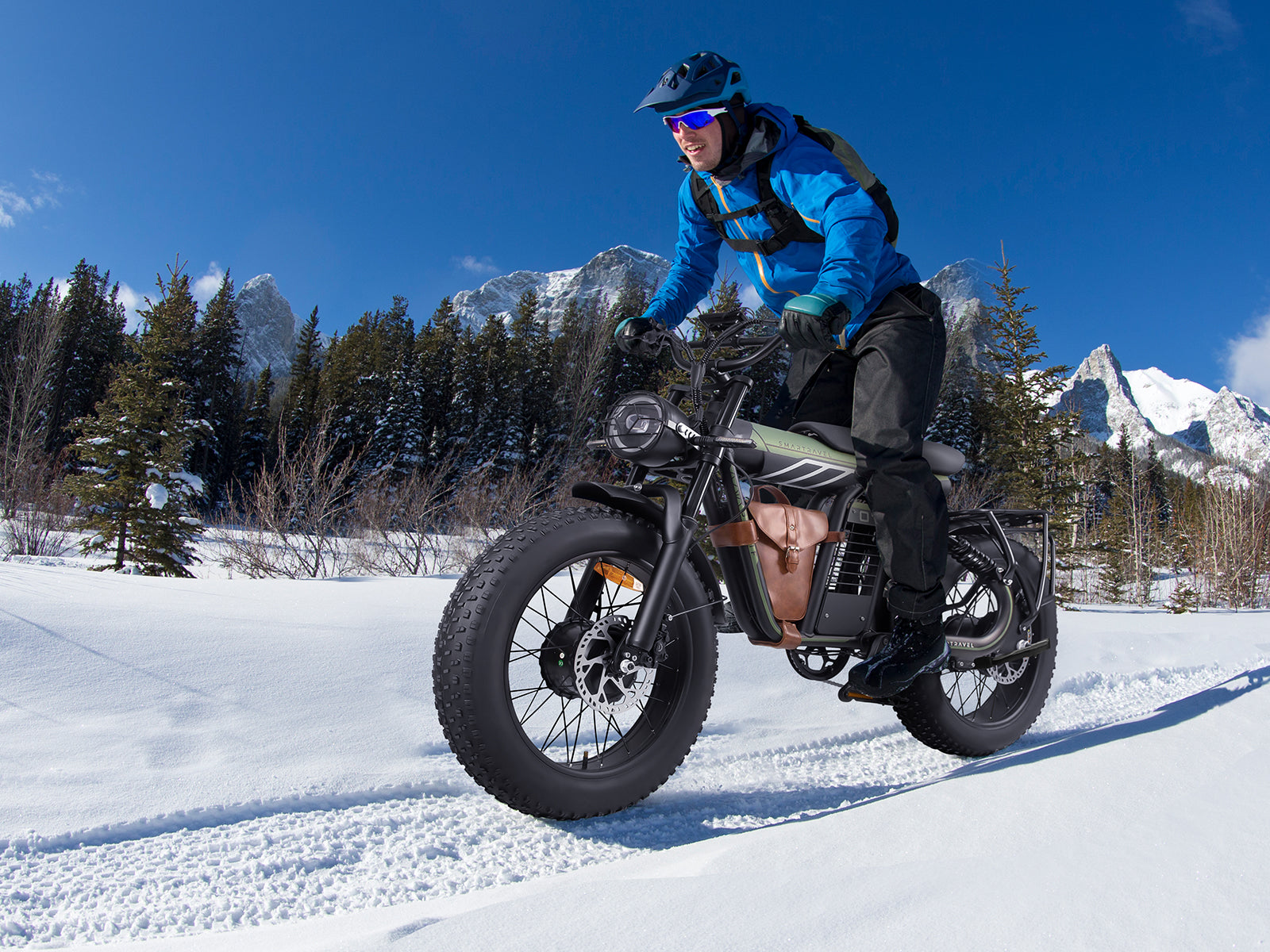 Fat tires (20 inches by 4 inches) designed for optimal traction and stability, allowing the bike to handle rough and uneven terrain with ease.